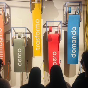 Immagino, cerco, trasformo, spero, domando. Sono i cinque verbi che accolgono chi accede alla grande sala quadrata in cui Fondazione Gi Group ha dato vita a un’installazione immersiva dal sapore artistico e partecipato.